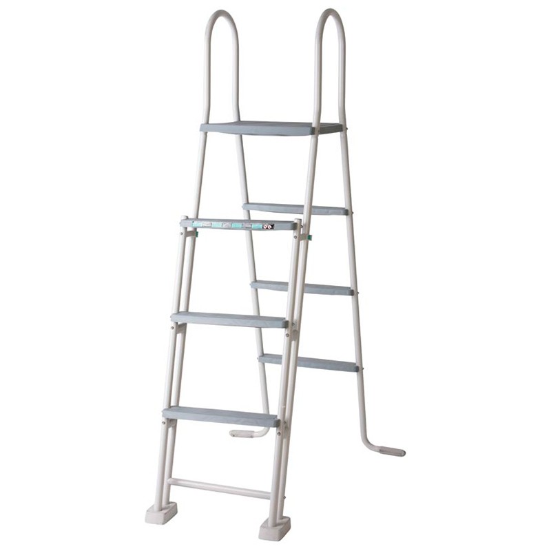 • Escalera de seguridad con plataforma y 6 peldaños (3×2). Permite desmontar los peldaños de un lado para impedir el acceso de los niños a la piscina y prevenir accidentes. Conforme a la norma Europea