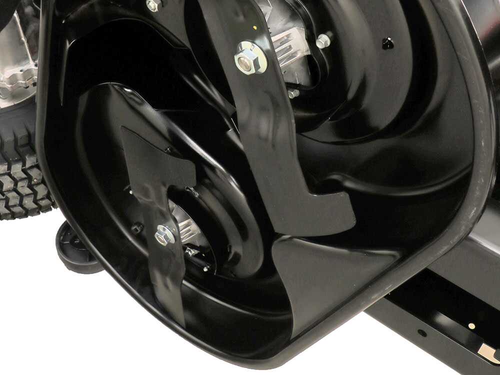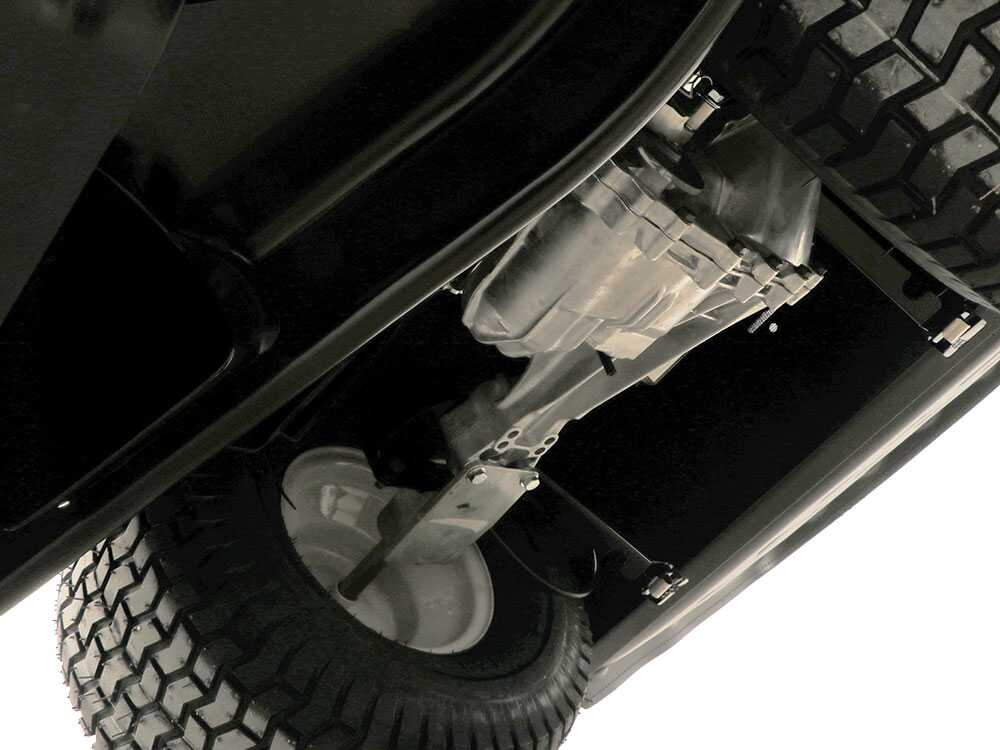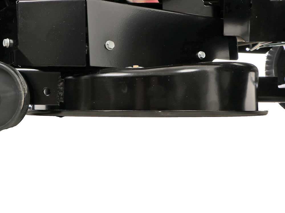 Las ruedas anti-roce evitan que se formen surcos en superficies delicadas cuando se trabaja en terrenos inclinados. Por último, la máquina está equipada con un plato de corte de dos cuchillas, de 105 cm, que garantiza un corte preciso y uniforme de la hierba.